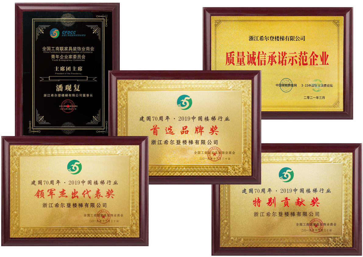 在不斷提升希爾登品牌和企業實力的同時,希爾登一直熱心參與樓梯行業的健康發展;參與創立全國工商聯樓梯專委會并被推選為中國樓梯品牌聯盟執行主席和樓梯專委會執行會長;憑借在行業內的專業地位,希爾登參與了《木質樓梯》,《木質樓梯安裝驗收和使用規范》,《住宅內用樓梯》,《建筑用玻璃與金屬護欄》四個國家和行業標準的起草工作。先后榮獲“中國樓梯十大品牌”、“金木樓梯領軍品牌”、“中國泛家居發展中企業500強”、“中國家裝行業金鉆獎”、“金屬木質樓梯一級資質”等二十多個榮譽和稱號。我們幾乎參與和見證中國樓梯發展歷程中的所有重大事件。希爾登過去,現在和未來都是中國樓梯的標桿企業。